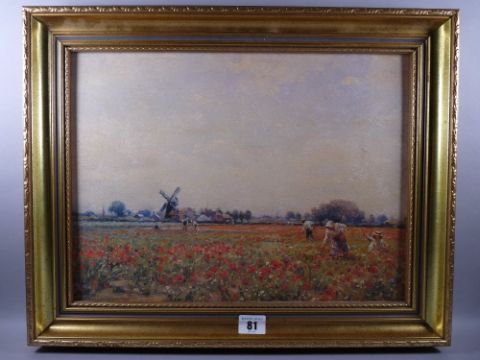 AFTER WILLIAM KAY BLACKLOCK coloured print on board - figures in poppy fields with distant windmill, printed signature, 29 x 39 cms