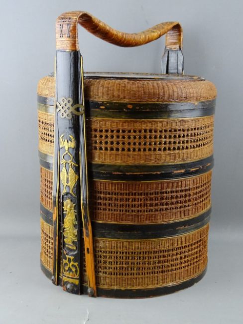 A VINTAGE CHINESE WICKERWORK WEDDING BASKET with carved gilt highlighted detail to the handle, 36.5 cms high overall