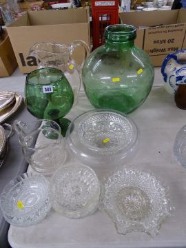 Vintage green carboy, an oversized glass water jug, a selection of various bowls etc