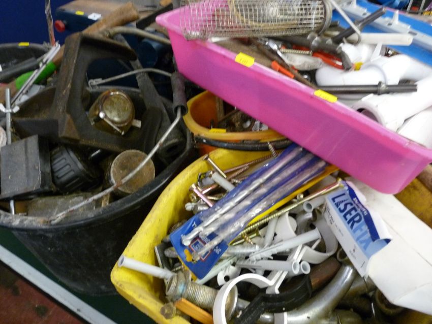 Parcel of multi-coloured buckets and a tray of various garage items and tools including last, drill bits, taps, car accessories etc