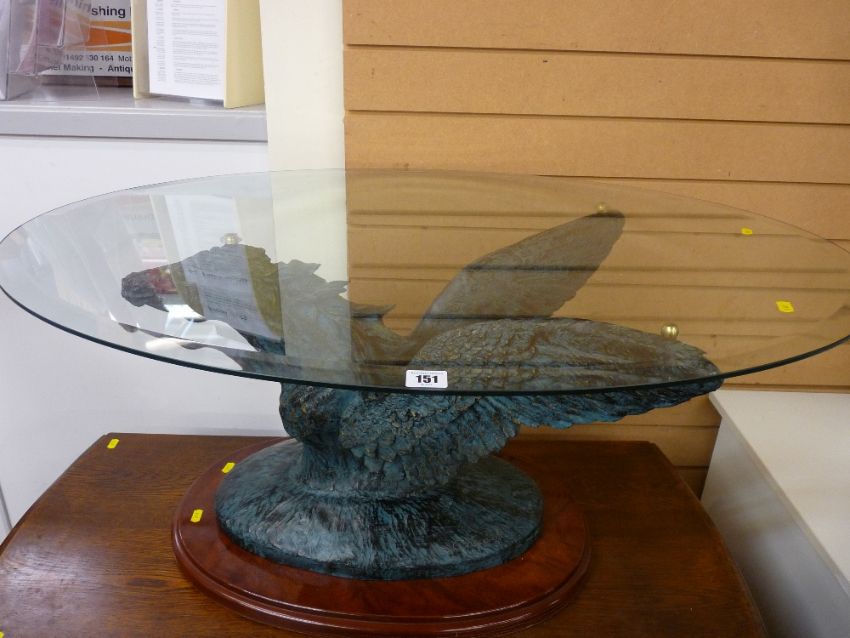 Glass topped oval coffee table with carved Pegasus sculptured base, signed 'Casasola'