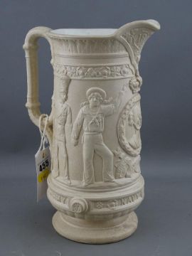 Rare Victorian Sandford pottery Crimean War jug titled '1860 The Defenders of Our Queen & Country, Our Army & Navy & Brave Volunteers'