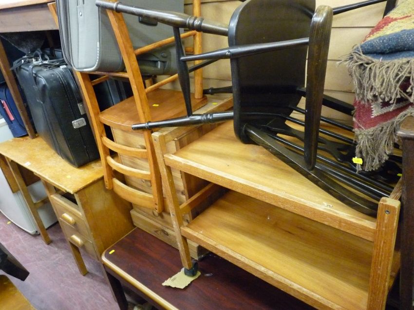 Dark wood coffee table, pine bedside chest of three drawers, two tier trolley, wheelback armchair etc
