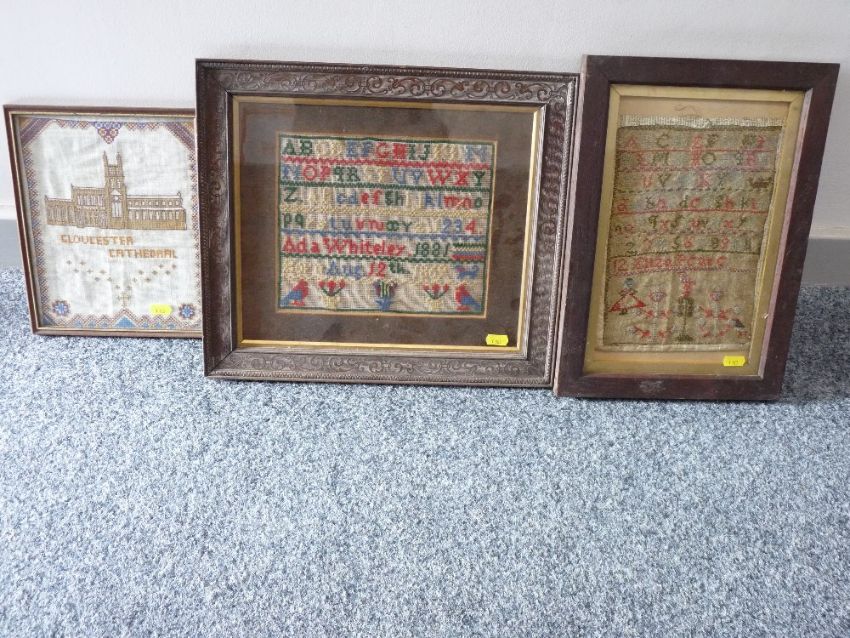 Three samplers, one dated 1881 by Ada Whiteley another by Eliza Peate aged 12 and one depicting Gloucester Cathedral