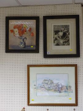 Interesting French engraving - workmen taking a break entitled label verso 'In the Forest', signed in pencil, 30 x 22 cms and other paintings/prints