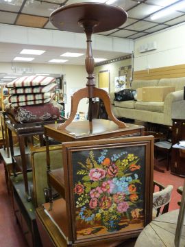 Reproduction mahogany two tier side trolley with single drawer and slide-out tray, an embroidered panel firescreen and a tripod wine table with gilt tooled green leather top