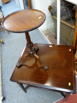 Stag type mahogany two tier side table and a reproduction tray top wine table on tripod ball and claw supports