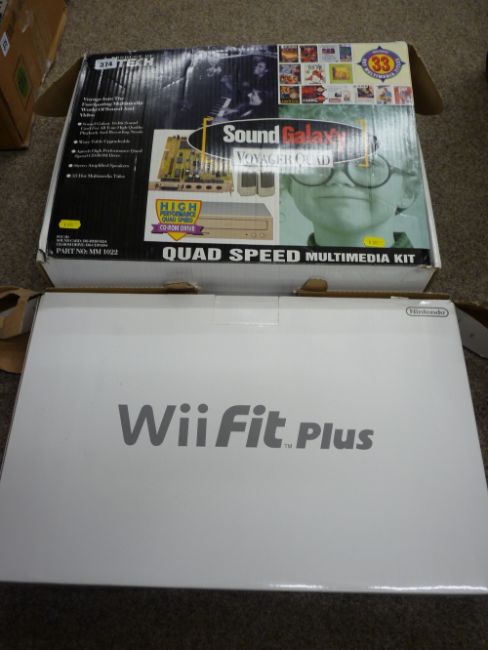 Boxed Sound Galaxy Vogager Quad multi-media kit (incomplete), a boxed Wii Fit Plus etc