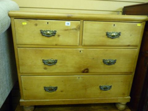 Antique stripped pine chest of two short over two long drawers on bun feet