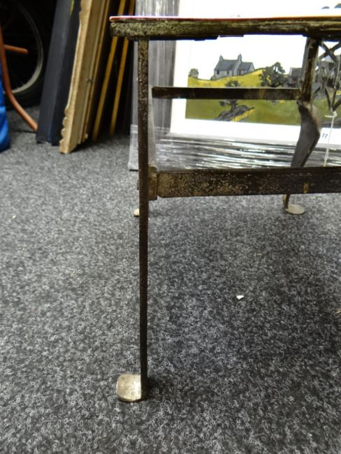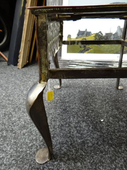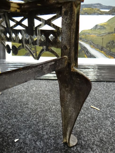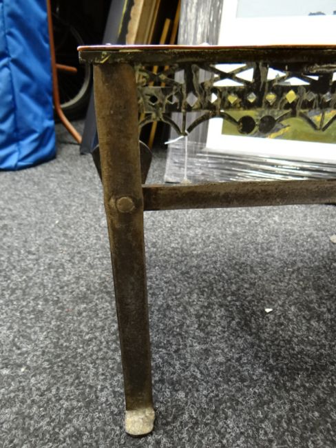 A VICTORIAN PIERCED COPPER FOOTMAN on ironwork corner supports, the copper inscribed R ROWLANDS 1887, pierced with heart, crescent & pair of goblets etc, 41cms wide x 29cms deep x 32cms high
