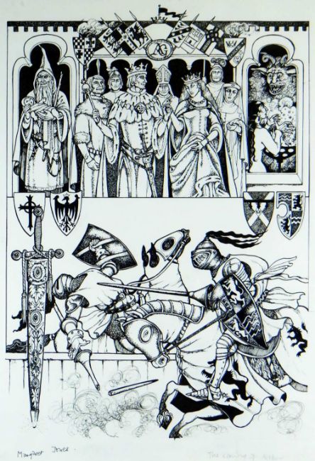 MARGARET JONES pen & ink - Arts & Crafts-style detailed drawing of a jousting competition with a balcony of regal watchers and monster, being an illustration from the book King Arthur by Gwyn Thomas & titled as 'The Coming of Arthur' (page 31 of the book), 54 x 34cms