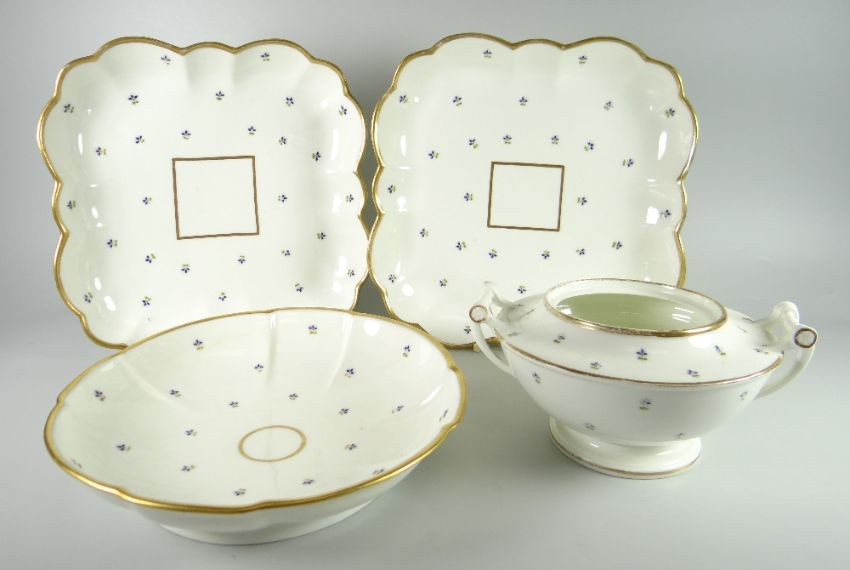A SWANSEA PORCELAIN CORNFLOWER PATTERN PART DINNER SET comprising pair of cruciform square dishes with lobed rim, circular cruciform shallow dish with lobed rim & a twin-handled sucrier (no lid), each element decorated with gilding to the rim & sequences of blue, green & red cornflower heads, square & circular dishes - 23cms wide / diam, sucrier - 17.5cms diam, circular dish has impressed mark SWANSEA
