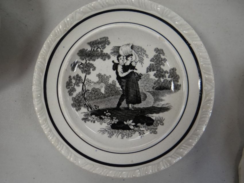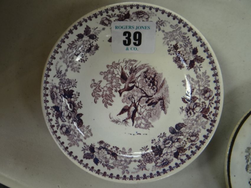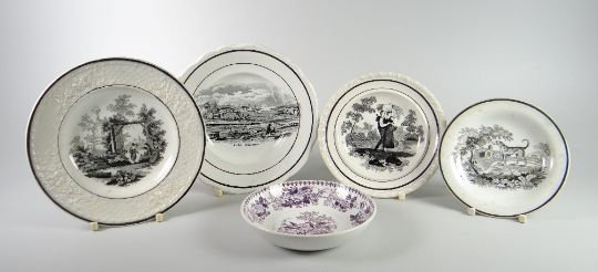 FIVE VARIOUS SWANSEA POTTERY COCKLE DISHES comprising Dillwyn with purple transfer of pheasants within floral border, 11cms diam, a black transfer Rural scene with impressed Dillwyn horseshoe mark to base, 12.5cms diam, a BB&I moulded border example with Rural transfer, impressed mark, 14.5cms diam, a Evans Glasson example with titled scene 'Bude Cornwall' and another with hunting dog and landscape (unidentified factory), 11cms diam