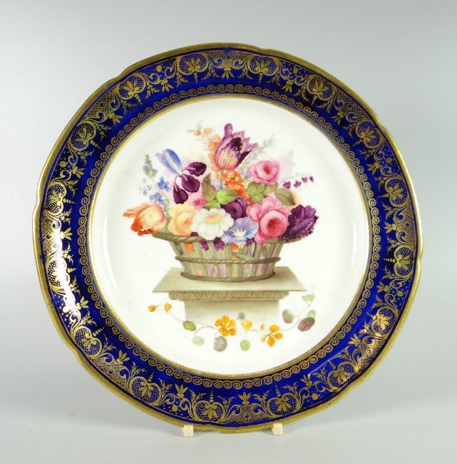 A SWANSEA PORCELAIN PLATE FOR THE 'LYSAGHT' SERVICE the interior decorated with a large basket of garden flowers on a pedestal by Henry Morris within a cobalt blue & gilded pattern border, no base marks, 24cms diam