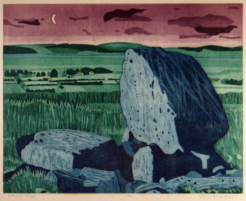 JOHN BRUNSDON limited edition (1/150) colour etching - Gower landscape with neolithic standing stones entitled 'Arthur's Stone', signed fully in pencil, 45 x 54cmsCondition Report: a little ‘browned’ around the border but I would not have thought that it would be a concern.