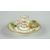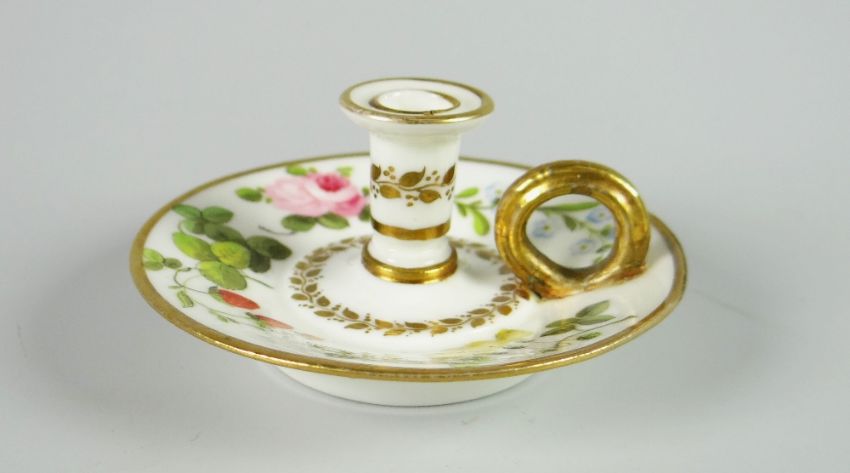 A FINE SWANSEA PORCELAIN MINIATURE TAPER STICK with loop handle and everted rim to the nozzle, the nozzle and rims picked out in gold and with circling laurels, the dish finely painted with flowers and wild-strawberries, script mark Swansea to base, 3.2cms high