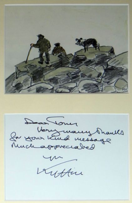 SIR KYFFIN WILLIAMS RA coloured print & greeting (framed as one) - the coloured print of a sheep dog & two farmers on a rocky mountainside, the greeting reading 'Dear Tony, very many thanks for your kind message, much appreciated' signed by the artist, 47 x 34.5cms