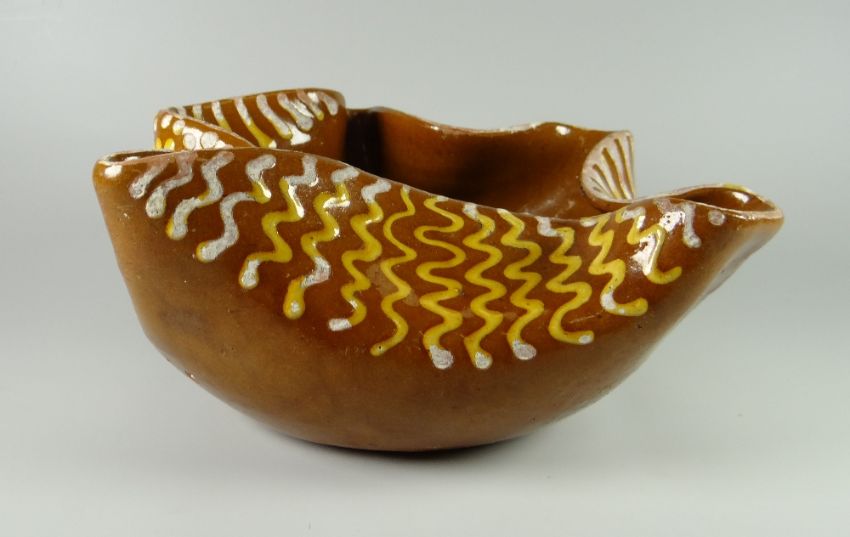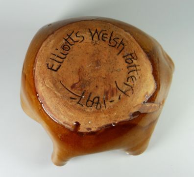 AN EWENNY POTTERY DISH BY H ELLIOTT of folded-neck form and decorated with slip trails, the base inscribed ELLIOTTS WELSH POTTERY 1897, 24cms diam