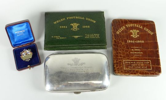 FOUR RARE & EARLY WELSH RUGBY ARTEFACTS comprising (1) an enamel on silver lapel-pin for Scotland v Wales 1896 bearing the Prince of Wales feathers, a leek and a thistle, engraved to the front 'At Cardiff' and with believed original case bearing retailer stamp for H Kaltenbach, Jeweller, Llanelly. (2) A silver cigarette case with silver-gilt interior, engraved to the lid with the Prince of Wales feathers and ' FOOTBALL UNION SOUVENIR SEASON 1908-9 WINNERS OF FIVE INTERNATIONAL MATCHES' 15 x 9.5cms (3) A brown 'crocodile-leather' wallet / season-ticket wallet, with gilded Prince of Wales feathers and inscription to read 'WELSH FOOTBALL UNION 1901-1902 G. HENRY, Vice-President (Admit to all Matches under control of the Welsh Football Union.)' 14.5 x 11cms. (3) a green leather silver-mounted wallet / season-ticket wallet with gilded Prince of Wales feathers and inscribed 'WELSH FOOTBALL UNION 1904-1905 G.HENRY, Vice-President (Admit to all Matches under control of the Welsh Football Union.) 10.5 x 15cms