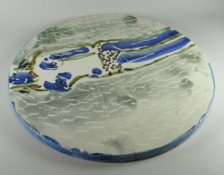 PHILIP SUTTON & FULHAM POTTERY CIRCULAR PLAQUE painted with a reclining nude, signed and dated 1987 by the artist and inscribed FULHAM POTTERY, 42cms diam