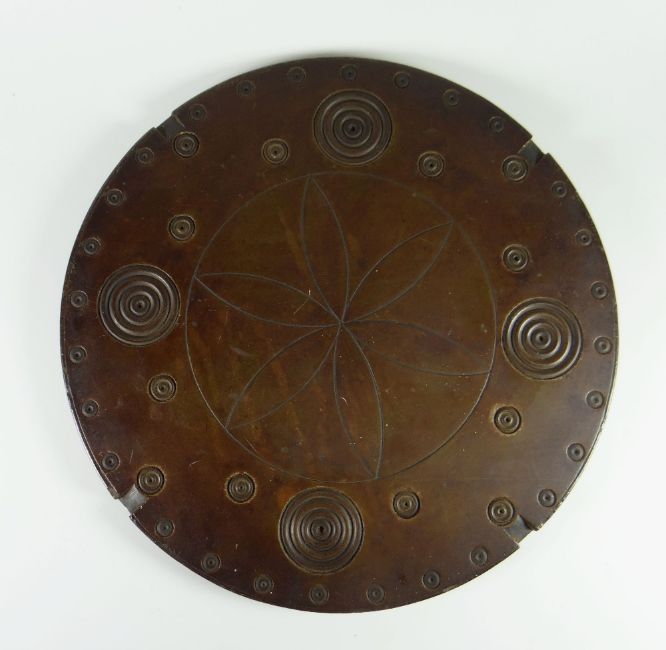 Auctioneer's Note: we are unsure how this fascinating piece of Welsh Folk art would have been used, there are grooves at 12, 3, 6 & 9 o'clock and a groove to the underside, a suggestion is that it may have been the top of a model tilt-top table