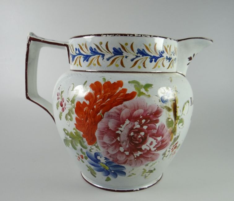 A SWANSEA POTTERY JUG inscribed Robert Westwood of Burntwood 1824, with chocolate trim and large painted spray of flowers, 16.5cms high