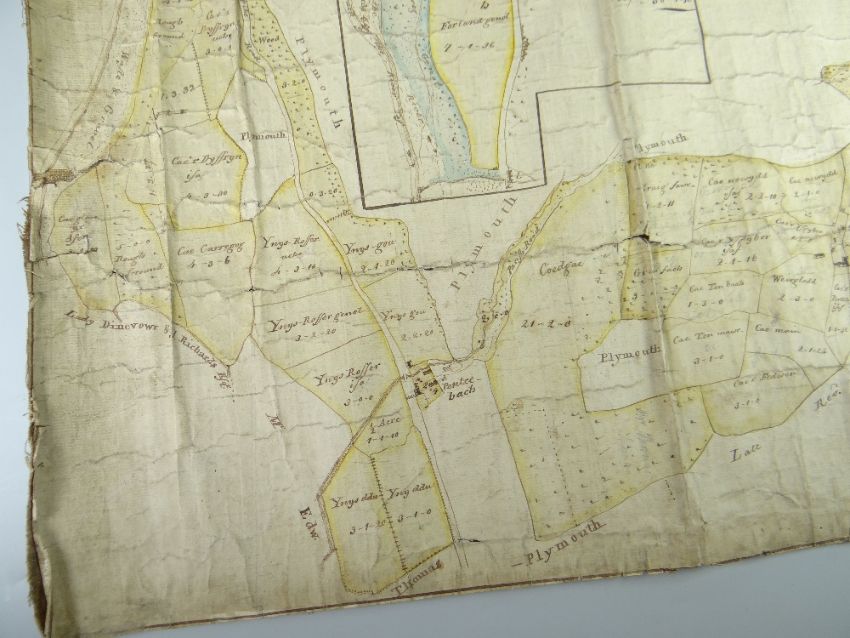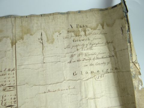 A LATE EIGHTEENTH CENTURY PEN, INK & WATERCOLOUR LINEN-BACKED MAP OF FARMLAND entitled A Plan of Pentre-Bach Farm, the property of Mr Edw. Thomas, Graweth Farm, the property of Rydyvi chapel? & part of Mr William David's farm, all in the Parish of Merthir Tidvile (sic) in the county of Glamorgan, 1791