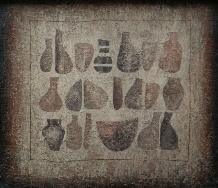 JONAS PLOSKY oil on board - illustration with rows of clay pots, entitled on Royal Academy Summer Exhibition 1985 label 'Unearthed Still Life', 27 x 32cms