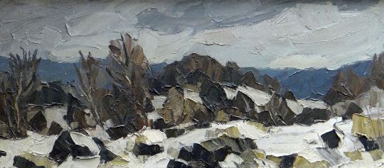 SIR KYFFIN WILLIAMS RA oil on canvas - winter landscape in Snowdonia, inscribed verso 'Snow in Nantmor', unsigned, circa 1970s, 50 x 111cms