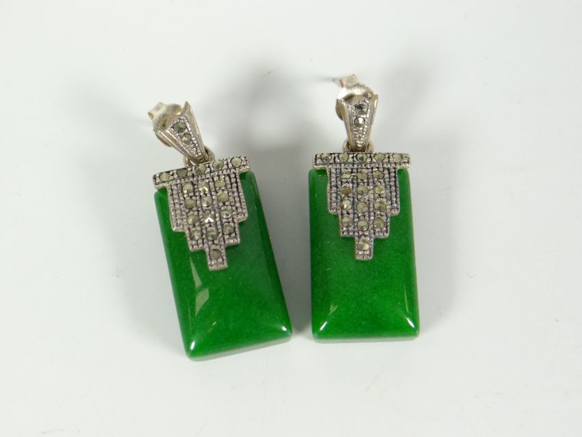 A pair of Art Deco possibly jade & marcasite drop earrings