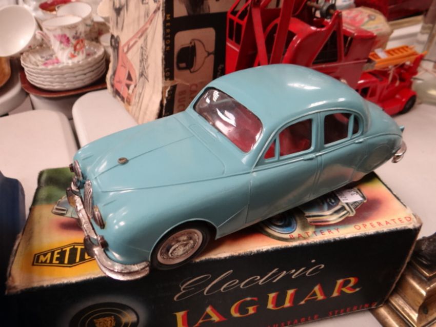A Tri-ang scale model Jones Crane KL44 with box together with a Mettoy Electric Jaguar car (boxed) and a Tri-ang Minic Fire Fighter