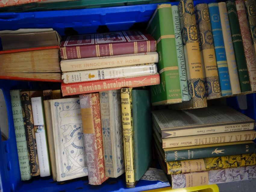 Nine plastic crates of mixed books including some interesting vintage hardback fiction, a tub of ordnance survey maps etc