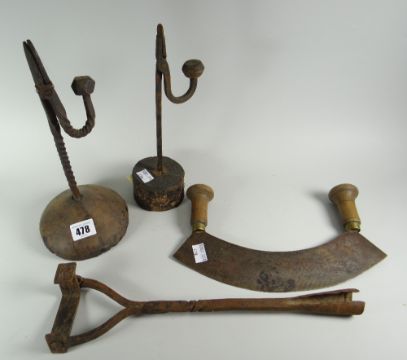 A parcel of four farmhouse items including two antique rush-light holders on wooden stands, a bladed instrument & a branding instrument