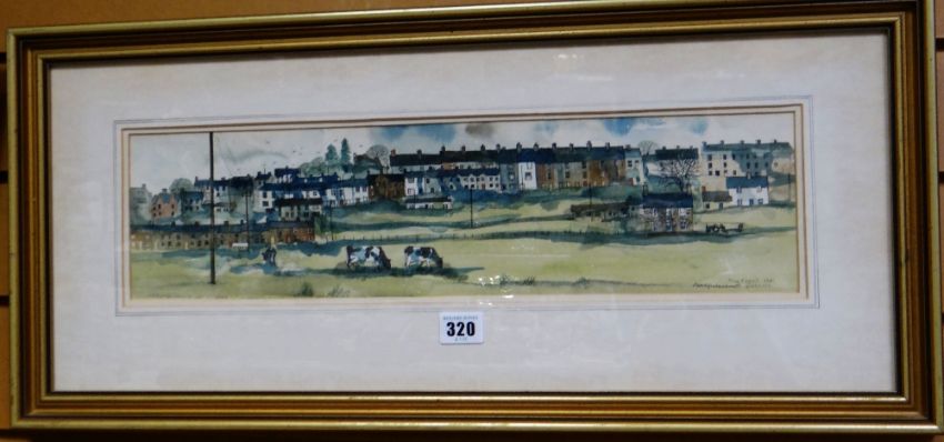 RAY EVANS watercolour - cattle & terraced houses entitled 'Penrhyndeudraeth, Gwynedd', signed & dated 1981, 13 x 48cms