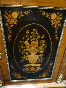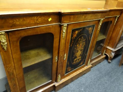 A good antique walnut and marquetry breakfront-credenza, composed of flanking glazed side cabinets & a centre cabinet enclosed with ebony floral panel and applied with decorative ormolu mounts, 182cms wide