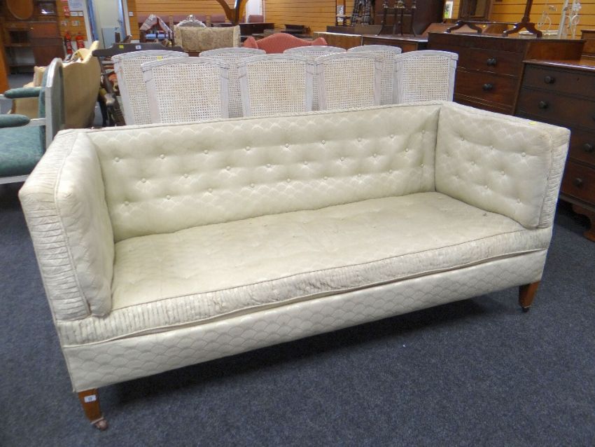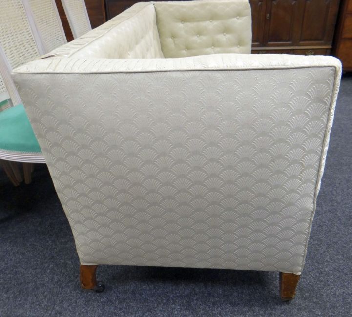 An antique Knowle-type sofa of rectangular form in believed original green fan-pattern buttoned fabric, 180 x 78 x 77cms