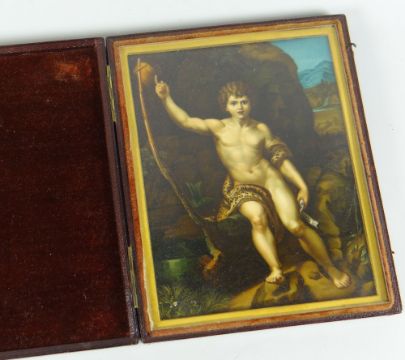 An interesting antique religious picture (believed painting) of John the Baptist with finger aloft, semi-robed and with landscape beyond in a leatherette folding case, possibly late Victorian