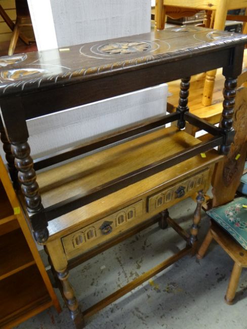 A white painted two-drawer wash stand & cabinet together with a carved stool & a linen fold-type two-drawer side table