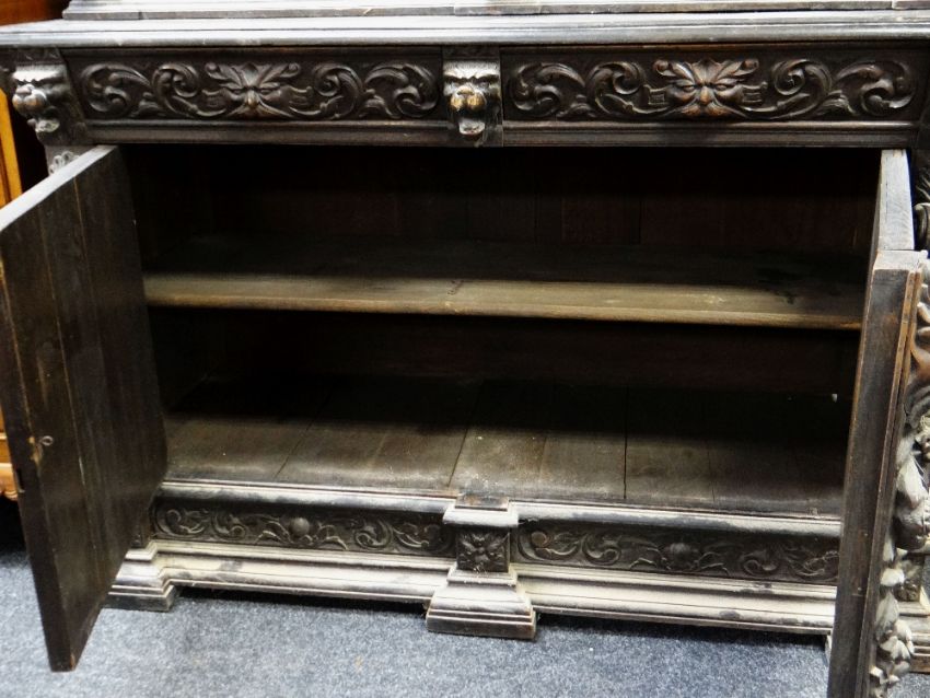 A large antique deep-carved stained dresser / bookcase cupboard carved with lion heads, including mask handles, florettes & vines of fruit etc, having two drawers above two cupboards & with two upper glazed cabinets, 152cms wide x 240cms high