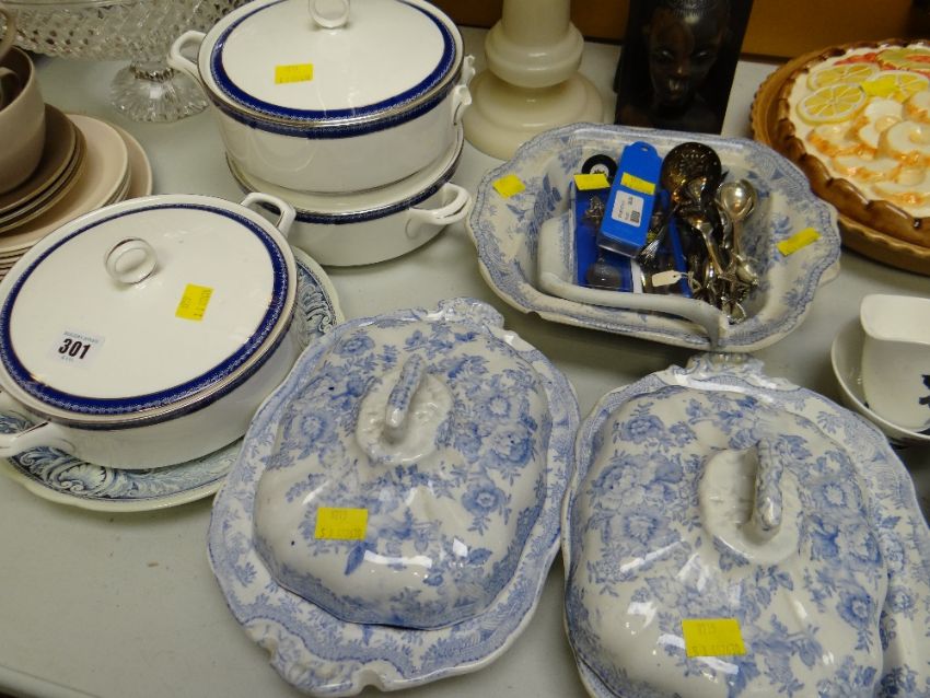 Pair of Asiatic Pheasant pottery tureens, three modern Royal Worcester tureens, sundry loose flatware etc