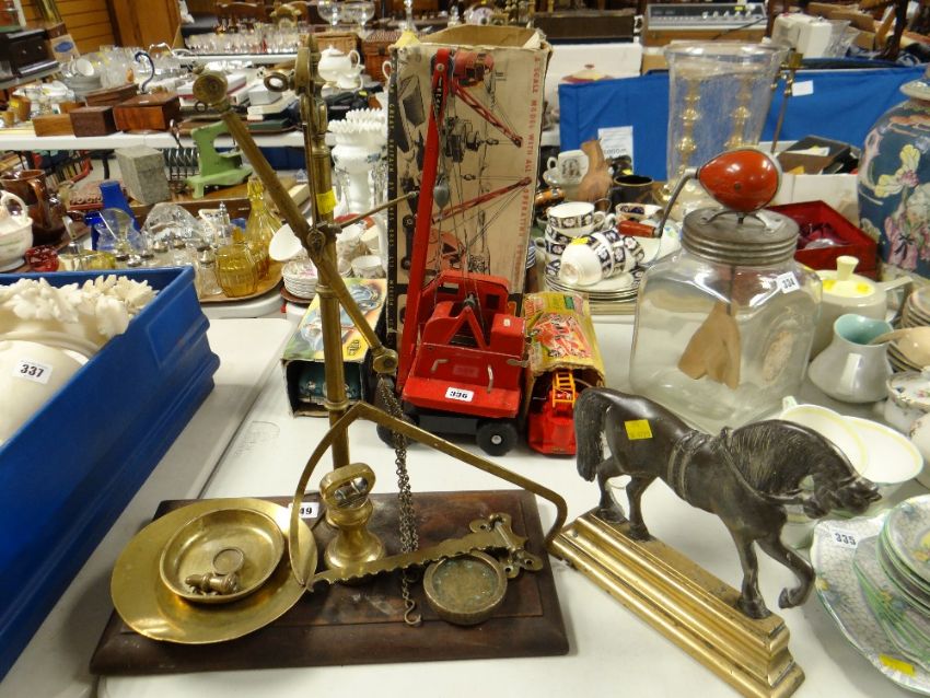 A vintage set of weighing scales, a brass bell weight, a metalwork & brass fireside horse ornament
