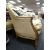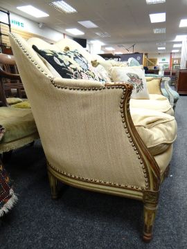 A good serpentine three-seater settee with carved floral supports on reeded legs with studded mustard coloured upholstery together with scatter cushions