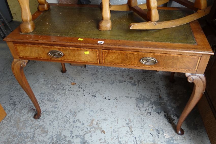 A reproduction two-drawer writing desk with tooled green leather top on cabriole supports