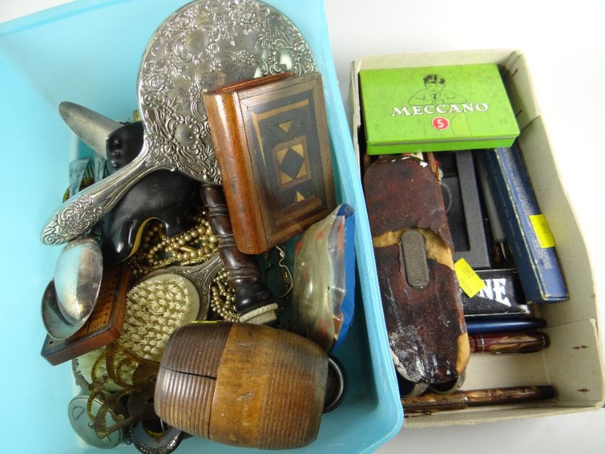 A mixed parcel of vintage collectables including pens, wooden items & curios