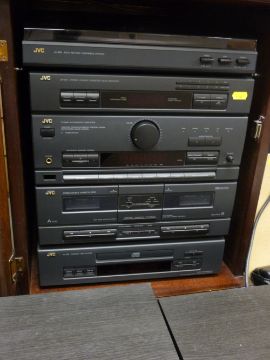 Inlaid cabinet containing a JVC hifi stereo and speakers E/T
