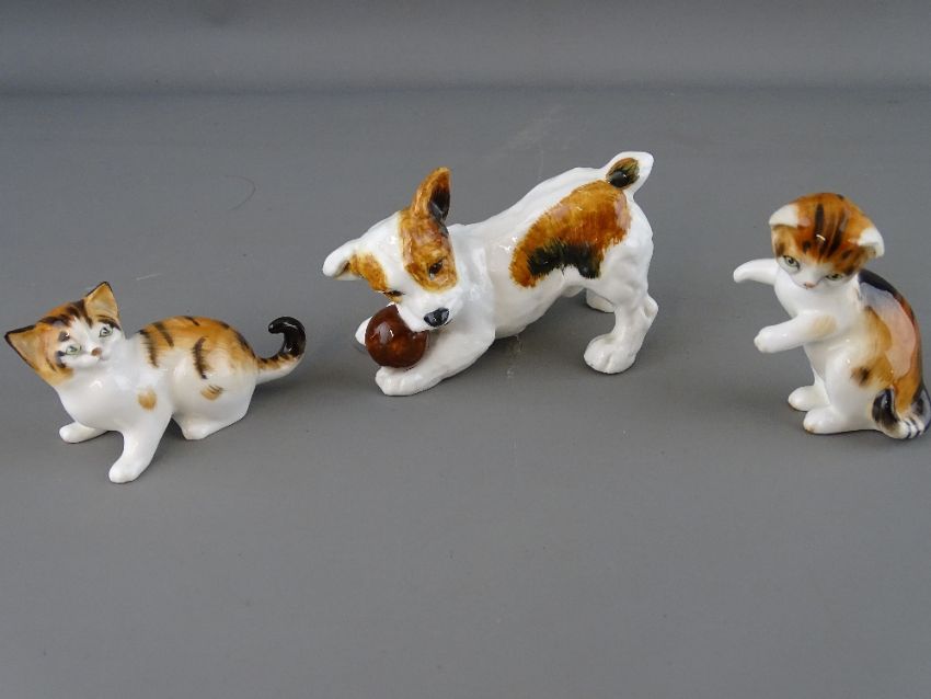 Royal Doulton terrier with ball HN1103 and two kitten figurines HN2582 and HN2584
