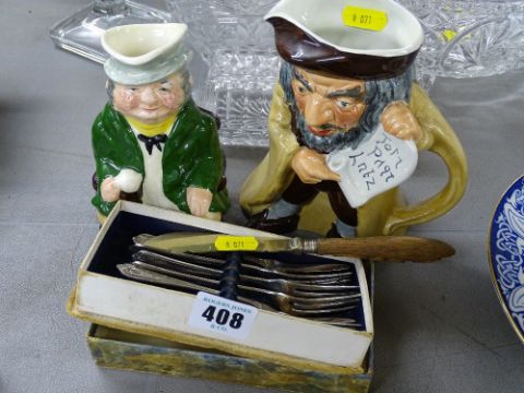 Sylvac Toby jug, a Staffs character jug and a box of cake forks etc