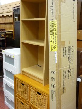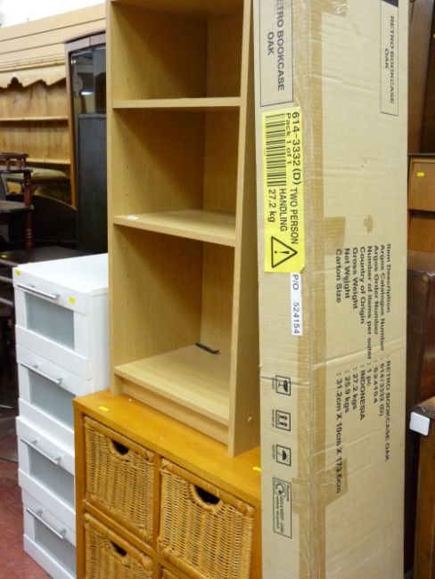 Parcel of white slim four drawer chest, modern four shelf bookcase, four basket weave drawer unit and boxed Hygena retro oak bookcase