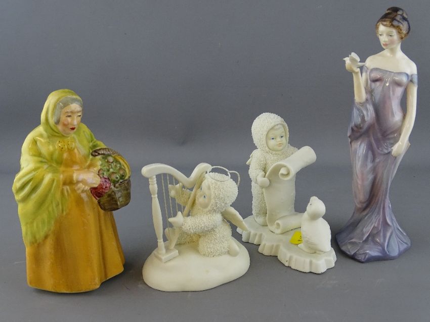 Royal Doulton china figurine 'Harmony' HN2824, a Coalport china figurine of a lady in a cloak and hood carrying a basket of flowers and two matt finish 'Music from Heaven' baby figurines
