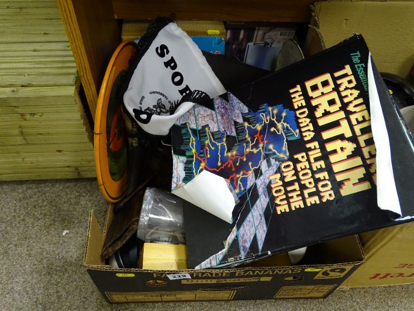 Box of miscellaneous items including boxed kerosene lamp, cigar case etc